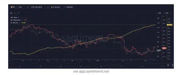«Ідеальною для біткоїну буде ситуація, коли дрібні гаманці, тобто роздрібні інвестори, скорочують свої запаси, тоді як група великих власників зростає. Це сигналізуватиме про перехід монет із слабких рук до сильних», — пояснили представники Santiment.