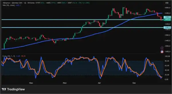 З погляду технічного аналізу тренд ефіру — низхідний. На користь цього говорить ціна, що знаходиться нижче 50-денної ковзної середньої (позначена синім кольором). Стохастичний осцилятор дає деяку надію бикам, пішовши в зону перепроданості — нижче за рівень 20. Поточні рівні підтримки та опору за денним графіком: $3363,5 та $3940,5 відповідно.