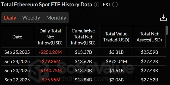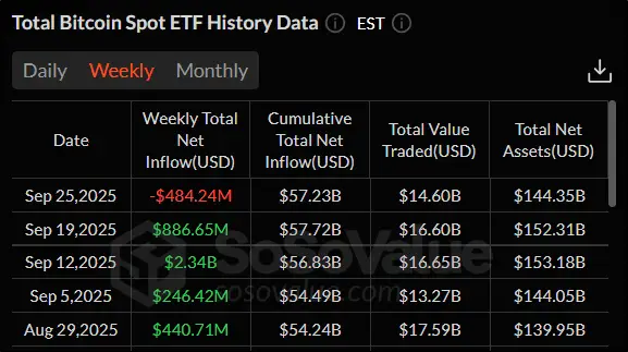 Негативу додали спотові ETF на біткоїн, де після чотирьох поспіль тижнів припливу коштів почався відтік. Загалом інвестори вивели грошей на суму $484,24 млн. Це перший подібний випадок у вересні 2025 року.