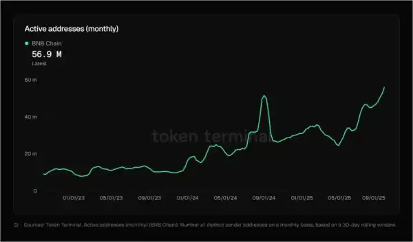 Можна відзначити низку позитивних факторів, які привели Binance Coin на початку тижня до історичного максимуму. Перше, на що варто звернути увагу, — рекордна кількість активних адрес у мережі. У вересні воно досягло 56,9 млн. За іронією долі, попередній рекорд було встановлено рік тому і становив 51,5 млн.