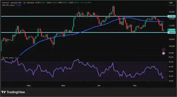 З погляду технічного аналізу, тренд біткоїну змінився з бичачого на ведмежий. Про це говорить перебування ціни нижче 50-денної ковзної середньої (позначена синім кольором). Індикатор RSI також свідчить про переважання продавців, оскільки опустився нижче за значення 50. А ось рівні підтримки та опору з минулого тижня не змінилися. Вони, як і раніше, знаходяться біля позначок $108 000 і $117 421 відповідно. Різниця полягає лише в тому, що тепер BTC торгується близько першої, а тиждень тому операції проходили близько другої.