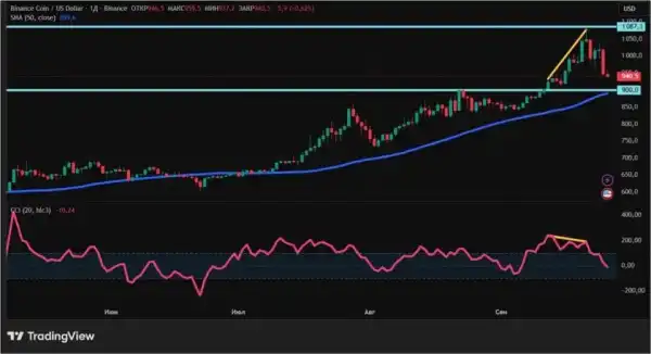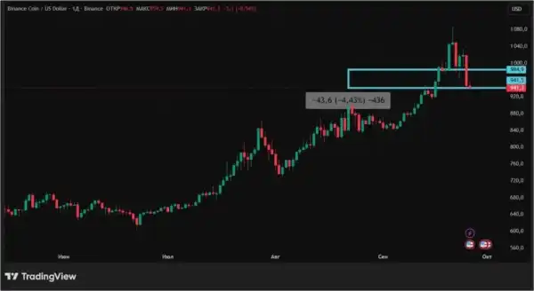 З 19 до 26 вересня курс криптовалюти BNB (Binance Coin) знизився на 4,43%. Причому початок тижня не передбачав падіння. У неділю, 21 вересня, BNB встановила новий історичний максимум $1087,3. Однак події другої половини тижня не дали криптовалюті закріпитися вище за $1000.