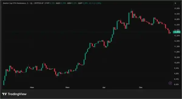 Падіння попиту на ETH не могло не вплинути на домінації активу. Лише за останній тиждень показник знизився на 0,74%, із 13,59% до 12,85%. Якщо ж брати термін із моменту початку зниження домінації ефіру 24 серпня, то падіння вже перевищило 2%.