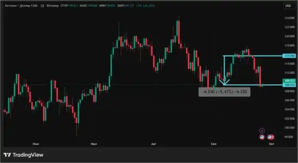 Біткоїн з 19 по 26 вересня 2025 року втратив майже 5,5% вартості. Найбільша по капіталізації криптовалюта опустилася нижче за важливу психологічну позначку — $110 000. Найбільше падіння було зафіксовано у четвер, 25 вересня, коли BTC впав на 3,81%.