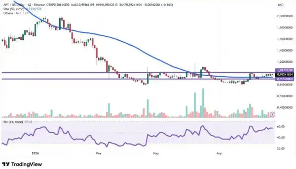 Станом на кінець квітня індикатори вказують на формування бичачого тренду. Ціна Aptos перевищує 50-денну ковзну середню (позначена синім), а RSI піднявся вище за значення 50. Найближчими рівнями опору для APT стануть $1,01, $1,08 і $1,12. Рівень підтримки – $0,91.