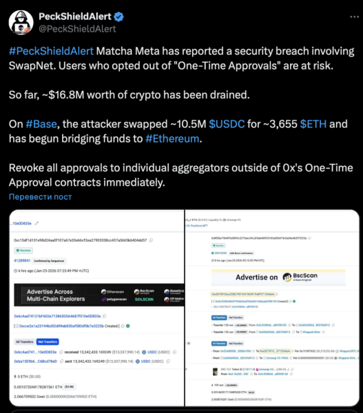 Інфраструктурний протокол SwapNet, який використовується для обміну криптовалютних активів та виконання свопів, був зламаний хакерами в ніч проти понеділка, 26 січня, повідомили фахівці з кібербезпеки компанії PeckShield. Збитки від атаки оцінені в $16,8 млн. Невідомий зловмисник обміняв близько 10,5 млн. USDC на 3655 ETH у мережі Base і почав виводити кошти через Ефіріум, стверджують експерти.