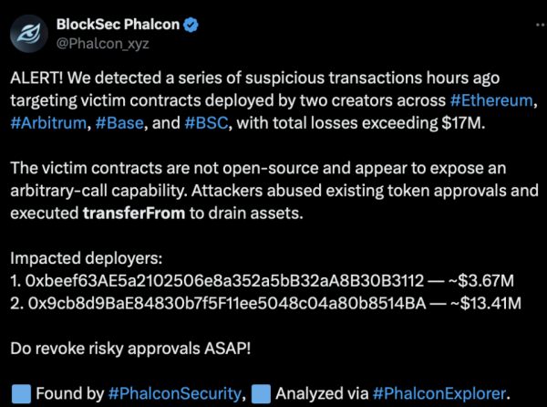 Одночасно з цією атакою відбулася інша. Фахівці компанії BlockSec кілька годин тому виявили серію підозрілих транзакцій від імені двох розробників у мережах Ефіріуму, Arbitrum, Base та BSC. Загальні збитки від атаки на вразливі смарт-контракти перевищують $17 млн, стверджують аналітики.