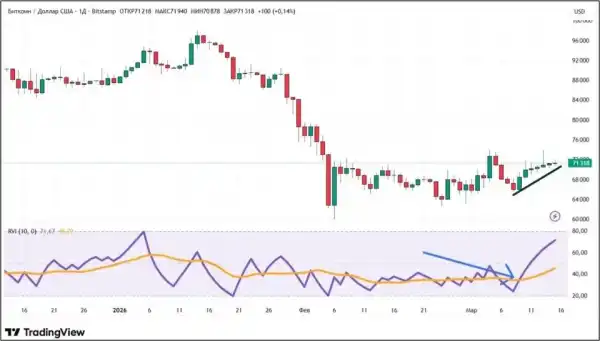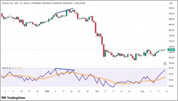 Класична ведмежа дивергенція склалася на денному графіку BNB у січні 2026 року. Ціна продовжувала зростати, тоді як індекс відносної бадьорості вже почав падати (відзначено синіми похилими лініями).