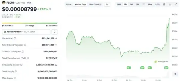 Ціна мемтокена Floki злетіла майже на 30%, досягнувши локального піку $0,00008799. Приводом для уваги трейдерів до токену стала посада засновника компанії Tesla та власника соціальної мережі X Ілона Маска, звернули увагу аналітики платформи CoinGecko.