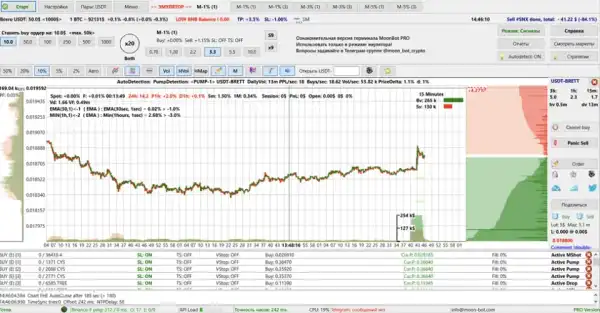 У Moonbot передбачено управління ордерами безпосередньо із графіка. Користувач може переміщати рівні входу, тейк-профіту та стоп-лосса за допомогою миші без ручного введення значень. Це спрощує супровід позиції та дозволяє оперативно коригувати параметри угоди у процесі торгівлі.