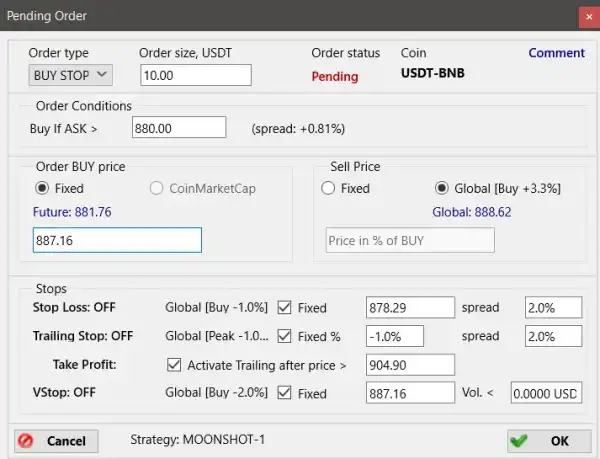 У результаті бот починає відбір монет, які за останні 15 секунд (PumpPriceInterval) зросли як мінімум на 3% (PumpPriceRaise). Одночасно з цим повинні бути дотримані такі умови: викуплений обсяг зі склянки (PumpVolPerSec) повинен бути не менше 0,5 BTC з умовою, що 50% обсягу, купленого в попередні 2 секунди (PumpVolEMA), та 100% обсягу останніх 2 секунд перевищать 0,5 BTCPump. Крім того, все це має супроводжуватися викупом мінімум шести ордерів (PumpBuysPerSec), який здійснять щонайменше два (PumpBuyersPerSecMin), а максимум двадцять (PumpBuyersPerSecMax) покупців. У цьому випадку, якщо трейдер виставить параметр AutoBuy = Yes, відбудеться автоматична покупка, якщо ж він буде вимкнений, то прийде повідомлення про те, що всі параметри було дотримано.