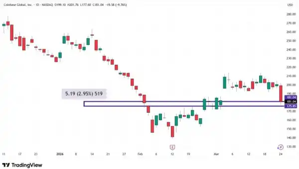 Друге місце у криптобіржі Coinbase з її ринковою капіталізацією $48,81 млрд. Перший весняний місяць 2026 року приніс акціям зростання на 2,95%. Варто зазначити, що позитивна динаміка склалася за рахунок перших торгових сесій березня, коли великі інвестори викуповували просідання. Та ж Ark Invest Кеті Вуд (Kathie Wood) придбала акцій Coinbase за цей період на $4 млн. Наступні три тижні пройшли у боковику. А ось 24 березня акції Coinbase обвалилися одразу на 9,76%, втративши майже все зростання початку місяця. Виною тому новини про те, що американський Конгрес серйозно обмежить прибутковість стейблкоїнів. Втілення цього сценарію в життя стане відчутним ударом по Coinbase, тож відсотки по стабільних токенах — одна з її конкурентних переваг.