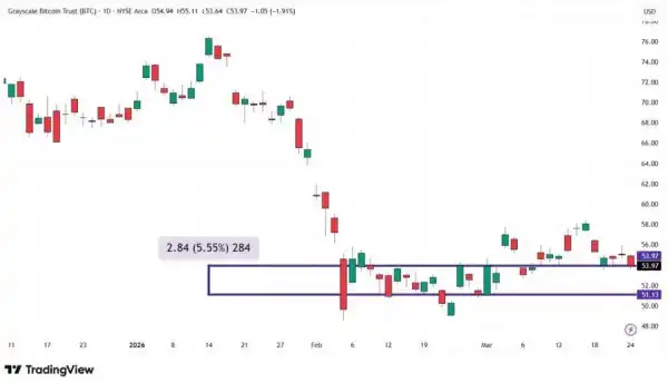 На п'ятому місці розташувався спотовий біткоін-ETF компанії Grayscale, Grayscale Bitcoin Trust, з ринковою капіталізацією $37,36 млрд. Його акції (паї) у березні зросли на 5,55%. Іранська криза та внутрішні економічні проблеми США майже не позначились на динаміці паперів. Найбільшого впливу справило зростання біткоїну, за ціною якого і слідує фонд. Цікаво, що з 1 квітня Grayscale Bitcoin Trust змінить свій бенчмарк. Якщо до цієї дати фонд буде проводити розрахунки чистих активів відповідно до CoinDesk Bitcoin Price Index (XBX), то після цього збирається орієнтуватися на CoinDesk Bitcoin Benchmark Rate. Відтік коштів із GBTC у березні продовжився і склав $110,97 млн.