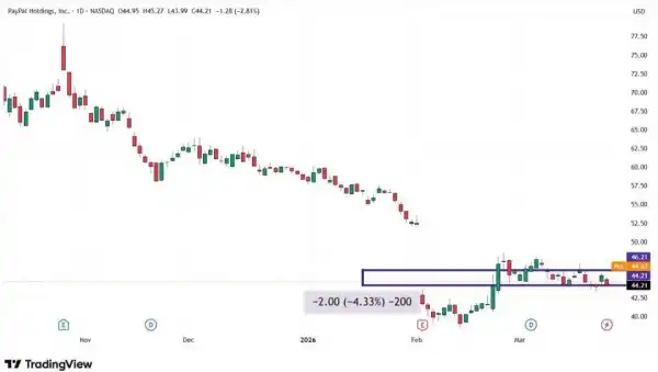 Четвертим у списку найбільших крипктокомпаній є платіжний сервіс PayPal з ринковою капіталізацією $41,36 млрд. Він не тільки надає клієнтам можливість розплачуватися за товари криптовалютою, але й емітує свій власний стейблкоін PYUSD. Акції компанії у березні знизилися на 4,33%. Починаючи з кінця лютого, торги цінними паперами PayPal проходять у боковику. Інвестори реагують на економічні дані. Зі позитивних новин можна відзначити, що PayPal розширив присутність свого PYUSD — тепер стейблкоїн доступний у 70 країнах.