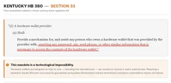 Американський Інститут політики біткоїну (Bitcoin Policy Institute, BPI) засудив законопроект, який схвалила Палата представників американського штату Кентуккі. Законопроект зобов'язує виробників апаратних гаманців давати можливість власникам відновлювати паролі, пін-коди та сид-фрази.