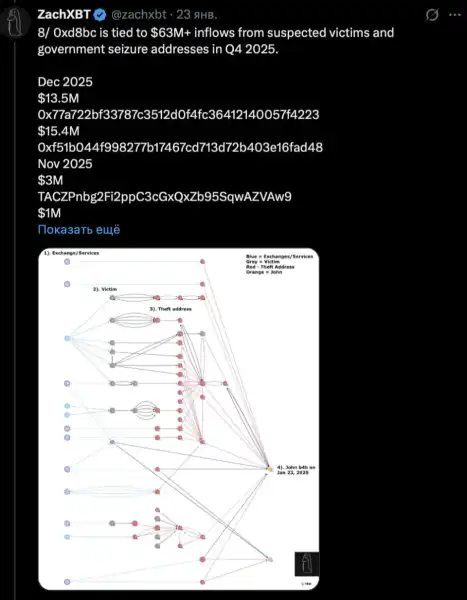 Другий ймовірний гаманець Джона, 0xd8bc, наприкінці 2025 року отримав ще понад $63 млн від адрес, пов'язаних із передбачуваними жертвами злому криптобіржі. 22 січня туди ж надійшло 4170 ETH (близько $12,4 млн) з якоїсь централізованої біржі, написав ZachXBT. Через кілька годин після публікації ZachXBT Джон відправив мікротранзакцію на публічну адресу криптодетектива zachxbt.eth з однієї з адрес, зазначених у матеріалах розслідування.