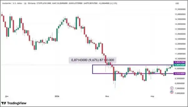 Криптовалюта Avalanche з 6 до 13 березня продемонструвала зростання на 9,67%. Токен AVAX оновив свій місячний максимум, досягнувши $9,95 на торгах у вівторок, 10 березня. Як і у випадку з біткоїном та ефіром, тиждень для Avalanche розпочався з двох негативних сесій, яким на зміну прийшли п'ять позитивних.