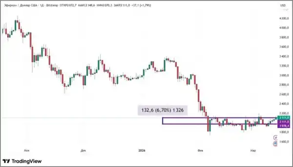 Ефір з 6 по 13 березня показав більшу динаміку порівняно з біткоїном, додавши 6,7%. Це дозволило ETH знову піднятися вище $2100. Тижневий рух другої капіталізації криптовалюти досить точно повторив шлях BTC: перші дві торгові сесії ціна знижувалася, а потім п'ять поспіль зростала.