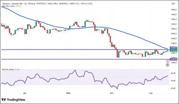 З погляду технічного аналізу, тренд в ефіру залишається низхідним. Це підтверджується положенням ціни нижче 50-денної ковзної середньої (позначена синім кольором). Хоча варто відзначити, що відстань вже мінімальна, що говорить про зростання сили покупців. На користь бугаїв свідчить і підйом індикатора RSI, який до того ж перевищив значення 50. А ось рівні підтримки та опору на денному графіку поки що залишаються незмінними: $1741,8 та $2149,9 відповідно.
