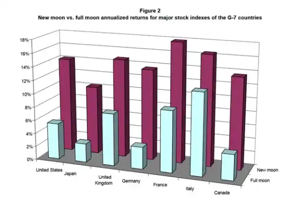 Інтерес до цієї теми виник задовго до крипторинка. У 2001 році дослідники університету Мічігану опублікували дослідження під назвою «Вплив місячних циклів на прибутковість акцій» («Lunar cycle effects in stock returns»). Автори дійшли висновку, що в періоди молодика середня дохідність акцій статистично вища, ніж у періоди повного місяця. Ефект спостерігався на фондових індексах різних країн, включаючи США.