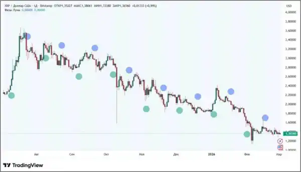 Наприклад, на представленому нижче денному графіку XRP періоди зростаючого Місяця (після молодика) і спадного Місяця (після повного місяця) зіставляються з динамікою ціни. У рамках низхідного тренду послідовні фази припадають нижчі цінові рівні, що формально відповідає логіці сигналу продаж.