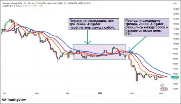 Як приклад розглянемо денний графік біткоїну на біржі Bitstamp. З початку грудня 2025 року до кінця січня 2026 року лінії індикатора перебували у щільному переплетенні, що відповідало фазі консолідації. Наприкінці січня відбулася їхня розбіжність, після чого сформувався спрямований рух униз.