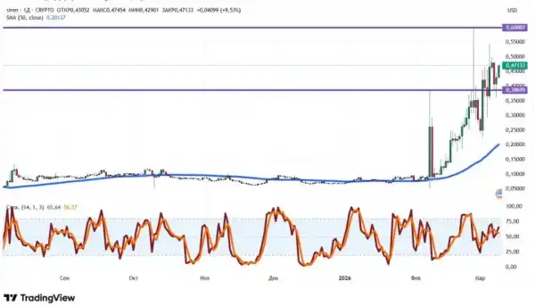 З 7 лютого 2026 року Siren знаходиться у вираженому бичачому тренді. За трохи більше місяця криптовалюта додала понад 400%.