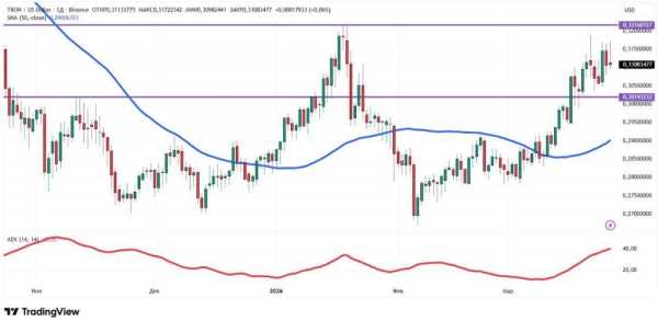 З погляду технічного аналізу, тренд Tron – висхідний. На це вказує положення ціни вище 50-денної ковзної середньої (позначена синім кольором). Тренд посилюється, що випливає зі зростання індикатора ADX. Найближчі рівні підтримки та опору за денним графіком: $0,302 та $0,322 відповідно.