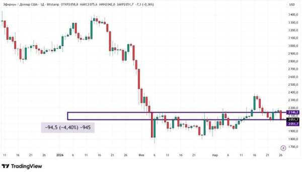 Ефір подешевшав із 20 по 27 березня на 4,4%. ETH весь тиждень робив безуспішні спроби підійти до позначки $2200. Сесія 26 березня, коли ефір обвалився на 5,03%, стала гіршою для другої капіталізації криптовалюти за більш ніж місяць, з 23 лютого.