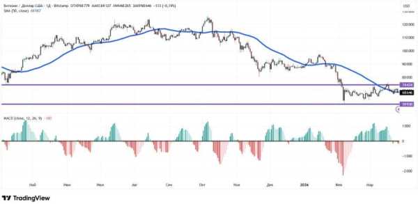 З погляду технічного аналізу, біткоїн торгується у чіткому каналі. До кінця березня ініціативою, згідно з індикаторами, володіють ведмеді. Ціна знову опустилася нижче 50-денної ковзної середньої (позначена синім кольором). Крім того, гістограма MACD перейшла з позитивної області негативну, що також ведмежий сигнал. Найближчі рівні підтримки та опору за денним графіком: $59 930 і $74 434 відповідно.