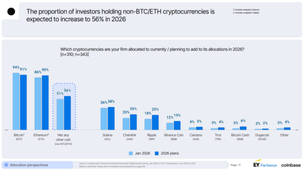 Окремо варто наголосити на опитуванні, яке провела криптобіржа Coinbase. Відповідно до нього, кількість юридичних осіб, які готові вкластися в криптовалюти, крім біткоїну та ефіру, сягає 56%. Частка корпоративних (інституційних) інвесторів, готових до кінця року вкластися в Tron, становила 4% — трохи вище 3%, зафіксованих у січні.