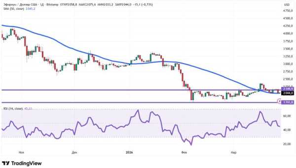 З погляду технічного аналізу, ефір не має чітко вираженого тренду. Ціна знаходиться близько 50-денної ковзної середньої (позначена синім кольором): то перевищує її, то опускається нижче. Підйом вище за рівень опору $2149,9 з 15 по 19 березня виявився бичачою пасткою. RSI опустився нижче за значення 50, що також говорить на користь продавців (ведмедів). Довгостроковий рівень підтримки на денному графіку – $1741,8.