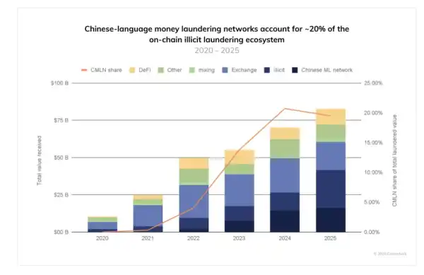 Подібні схеми працюють ще з часів пандемії коронавірусу, і за останні п'ять років через них пройшло близько 20% незаконних криптозасобів, що відстежуються. З 2020 року приплив грошей до ідентифікованих китайськомовних мереж зростав у 7325 разів швидше, ніж на централізовані біржі, розповіли аналітики.