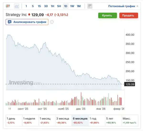 У четвер, 5 лютого, акції Strategy торгуються близько $129. За останній місяць на тлі обвалу біткоїну котирування компанії просіли більш ніж на 20%, а з жовтневого піку – на 50%.