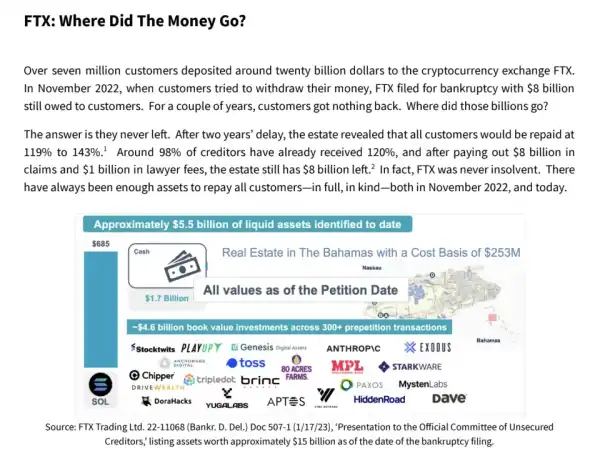 Бенкман-Фрід опублікував текст, де стверджує: FTX ніколи не була неплатоспроможною. За словами бізнесмена, активи 7 млн користувачів на $20 млрд не зникли, а на момент «юридичного краху» у листопаді 2022 року біржа мала більше $16 млрд власних коштів — проти $8 млрд вимог.