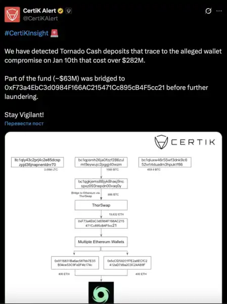 Монети приблизно на $63 млн були направлені через орієнтований на конфіденційність протокол змішування сервіс-міксера Tornado Cash. Частина викрадених біткоїнів була переведена в Ефіріум через крос-чейн-своп. Ця технологія дозволяє взаємодіяти між різними мережами та обмінюватися активами, пояснили фахівці з безпеки. Після конвертації біткоїнів в ефір кошти розподілили на кілька адрес, повідомили представники CertiK.