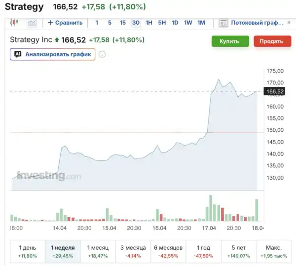 За даними Investing, на тлі оголошення зміни дивідендної політики акції MSTR зросли майже на 12% — до $166,52. За місяць зростання становило 29,45%, а середній денний обсяг торгів збільшився більш ніж удвічі за останні три місяці.