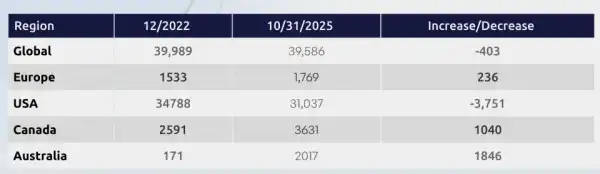 У загальному рейтингу за темпами приросту з грудня 2022 року до жовтня 2025-го лідирують Канада та Австралія. Ці країни наростили свої мережі на 1040 та 1846 пристроїв відповідно.