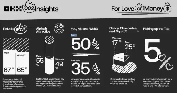 50% чоловіків і 35% жінок були б не проти спробувати додаток для знайомств, який підбирає партнерів за інтересами до криптовалюти чи «сумісності гаманців». Найбільший інтерес виявили молоді чоловіки: 65% чоловіків-зумерів та 64% чоловіків-міленіалів. 53% дівчат-зумерів та 48% жінок-міленіалів також висловили зацікавленість.