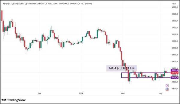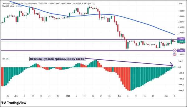 Ефір, як і біткоїн, з 27 лютого по 6 березня додав понад 7%. Це дозволило ETH закріпитися понад $2000. Цікава особливість минулих семи днів: торгові сесії зростання та падіння йшли по черзі. Перших набралося чотири, других – три.