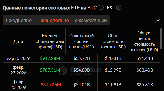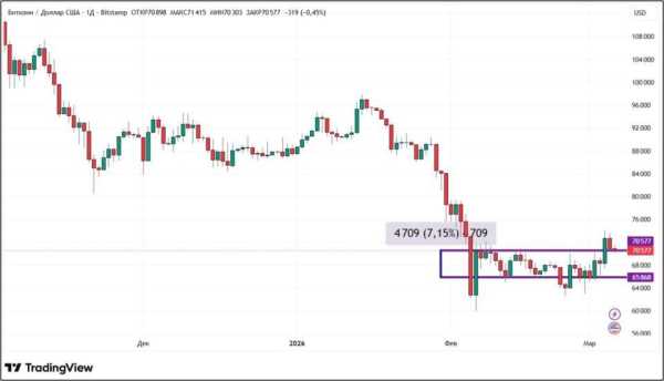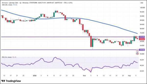 З 27 лютого по 6 березня 2026 року біткоїн зріс на 7,15%. Найбільша по капіталізації криптовалюта знову подолала важливу психологічну позначку $70 000. Незважаючи на позитивну динаміку, торгових сесій, де фіксувалося зростання, було менше тих, де спостерігалося падіння: три проти чотирьох.