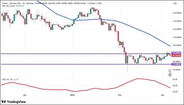 З погляду технічного аналізу, тренд Solana – низхідний. Це підтверджується положенням ціни SOL нижче 50-денної ковзної середньої (позначена синім кольором). Проте тиск продавців поступово слабшає, про що свідчить зниження індикатора ADX, який характеризує силу тренду. Найближчі рівні підтримки та опору на денному графіку розташовані близько позначок $77 та $90 відповідно.