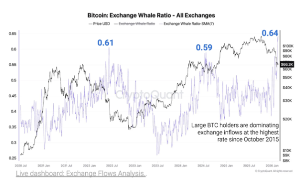 «Індикатор Exchange Whale Ratio досяг 0,64 – максимуму з жовтня 2015 року. Це означає, що 64% усіх надходжень біткоїну на торгові майданчики припадає на десять найбільших транзакцій», – пояснили в CryptoQuant.