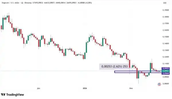 Одна з причин бурхливого підйому Dogecoin на початку тижня – торгові обсяги, що виросли. На південнокорейських біржах найбільший за капіталізацією мемкоін взагалі зайняв п'яте місце з $122 млн, обігнавши більші BNB, Solana, USDC і Tron. Крім того, з 13 по 15 лютого спостерігалося значне зростання відкритого інтересу. Він сягнув майже 30% за два дні. Щоправда, потім пішов на спад.