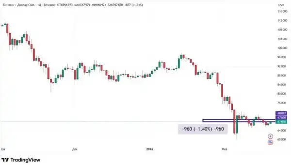 З 13 по 20 лютого 2026 року вартість біткоїну знизилася на 1,4%. Усі денні торговельні сесії супроводжувалися відносно низькою динамікою. Лише в одному випадку у вівторок, 17 лютого, ціна першої криптовалюти за підсумками доби змінилася більш ніж на 2%.