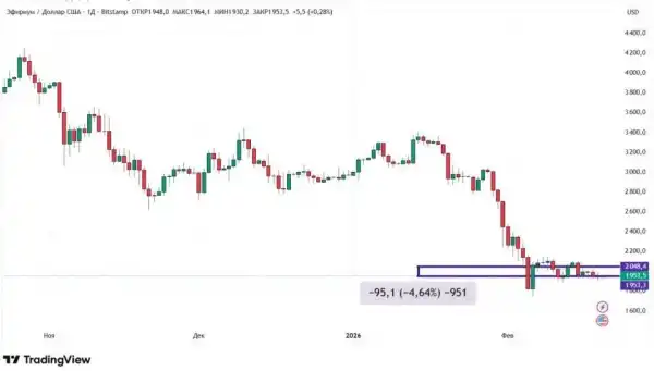 Ефір із 13 по 20 лютого продовжив своє зниження, втративши ще 4,64% вартості. Усі сім днів торгів пройшли у досить вузькому діапазоні між $1900 та $2100. Якби не падіння на 5,77% у неділю, 15 лютого, то динаміка ETH була б навколонульовою.