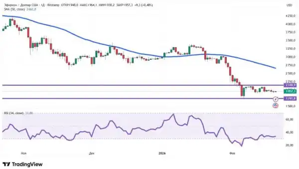 З погляду технічного аналізу, тренд ETH залишається низхідним. Про це говорить положення ціни нижче 50-денної ковзної середньої (позначена синім кольором). RSI, хоч і вийшов із зони перепроданості, все ще знаходиться нижче значення 50, що також свідчить на користь продавців (ведмедів). Найближчі рівні опору та підтримки на денному графіку: $2149,9 та $1741,8 відповідно.