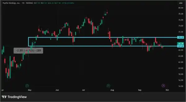 На четвертому місці розташувався платіжний сервіс PayPal, який надає можливість розплачуватись у криптовалютах, з капіталізацією $64,29 млрд. У вересні 2025 року його акції знизилися в ціні на 4,12%. Ось уже другий місяць поспіль цінні папери PayPal торгуються у вузькому діапазоні між $67 та $70, рідко виходячи за ці межі. Після того, як ФРС оголосила про зниження ключової ставки, акції компанії перейшли до зниження. Однак його розмір виявився не критичним: ціна спустилася від верхньої межі боковика $70 до нижньої $67.