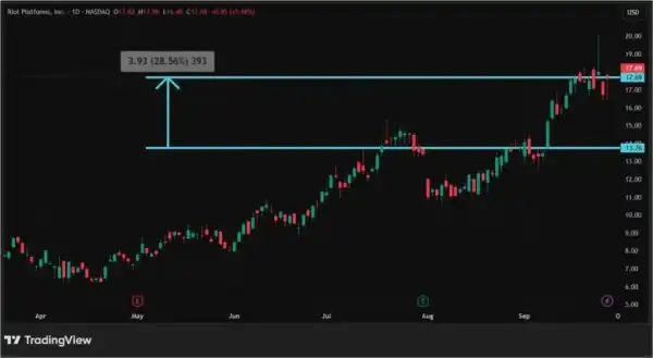 Відкриває список найбільших криптокомпаній майнер MARA (колишня Marathon Digital) із ринковою капіталізацією $5,97 млрд. Її акції у вересні додали лише 0,94%. При цьому, у першій половині місяця вони демонстрували серйозне зростання, торгуючись понад $19. У цілому нині динаміка MARA повторювала рух биткоина, що ні дивно, оскільки що стоїть ціна BTC, то вище прибуток компанії. Однак після зниження ключової ставки на 25 базисних пунктів все зростання зійшло нанівець. Очевидно, інвестори були налаштовані на рішучіші кроки від регулятора.