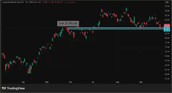 П'яте місце у спотового ETF на біткоїн від компанії Grayscale — Grayscale Bitcoin Trust із ринковою капіталізацією $59,3 млрд. У вересні 2025 року акції (паї) фонду подорожчали на 0,78%. Місяць для цінних паперів GBTC був поділений на дві частини: у першій вони росли, у другій падали. Підйом спостерігався до оголошення про зниження ставки. Після засідання ФРС GBTC перейшов до зниження. Основною новиною місяця стало прагнення Grayscale Investments провести IPO. У самому фонді продовжує фіксуватися відтік коштів. У вересні він становив $227,25 млн.